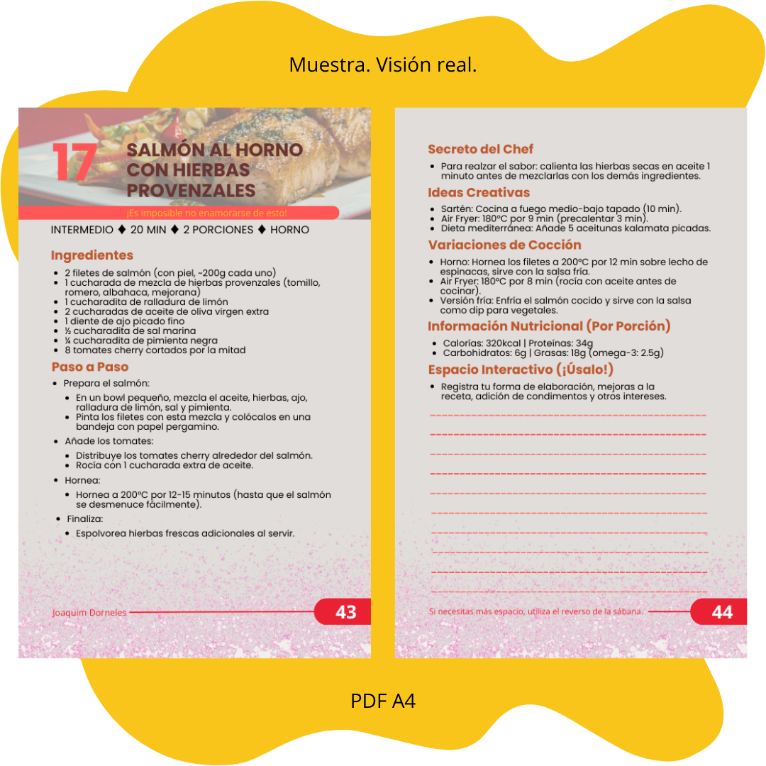 Esta reproducción muestra una receta completa como todas las demás del ebook: ingredientes detallados, paso a paso, consejos técnicos infalibles y espacio para anotaciones y creación de tus propias versiones. ¡Cuantas quieras! Cada página ha sido cuidadosamente elaborada para transformar tu experiencia en la cocina.